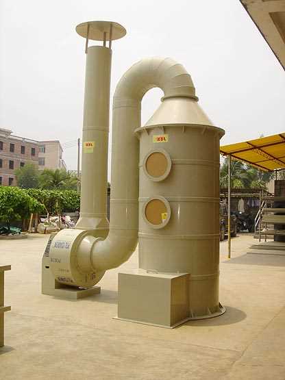 玻璃鋼洗滌塔是硫酸生產線的主要設備,該塔的主要作用是:由塔底進塔的帶有礦塵、砷、硒、氟、二氧化硫等雜質和二氧化碳氣體,經填料層,由塔頂排出。而稀硫酸通過塔頂?shù)膰娮靽娏,使之填料層中氣液充分接觸,除去雜質,達到凈化氣體的作用。